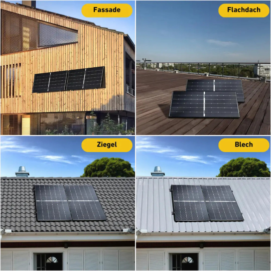 Komplettsets: Abgestimmte Systeme mit passenden Halterungen für Gitterbalkone, Flachdächer, Ziegeldächer oder die freie Aufstellung im Garten.